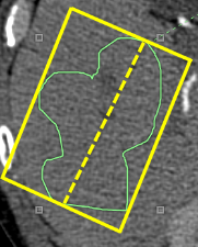 - Length of Minor Axis - calculated by drawing lines that are parallel and perpendicular to the major axis (shown as the dotted yellow line in the illustration) forming a rectangle (shown as solid yellow box) that contains the ROI. The minor axis is the length of the box that is perpendicular to the major axis